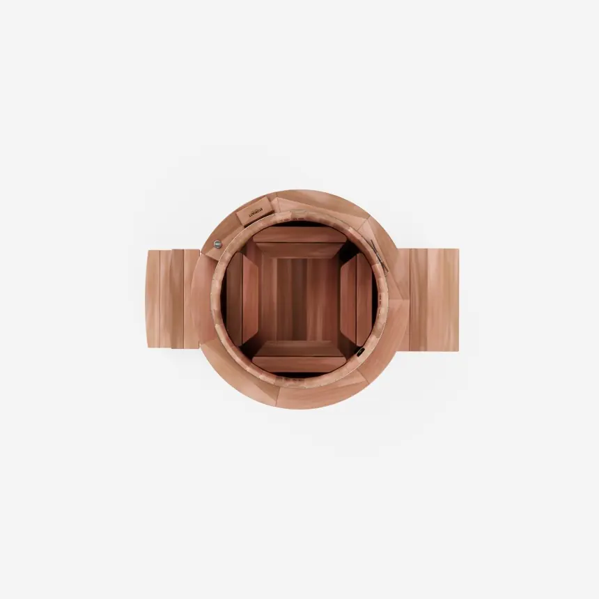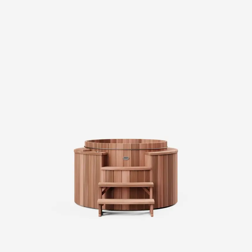 Le spa en bois Størvatt hors-sol, modèle breveté, se distingue par son unicité. Son revêtement circulaire en Red Cedar massif de 38 mm d'épaisseur confère une esthétique épurée ainsi qu'une excellente isolation thermique.